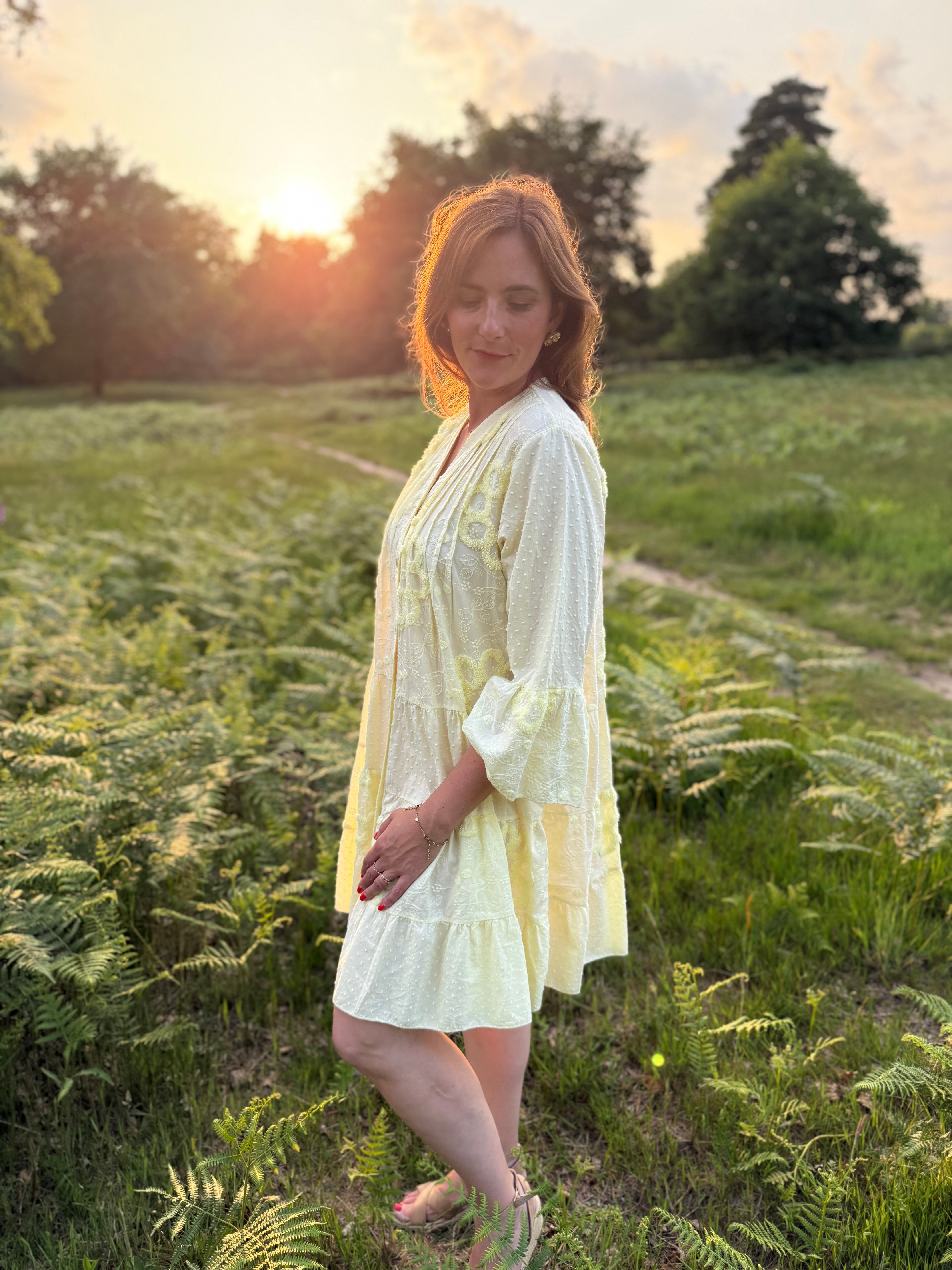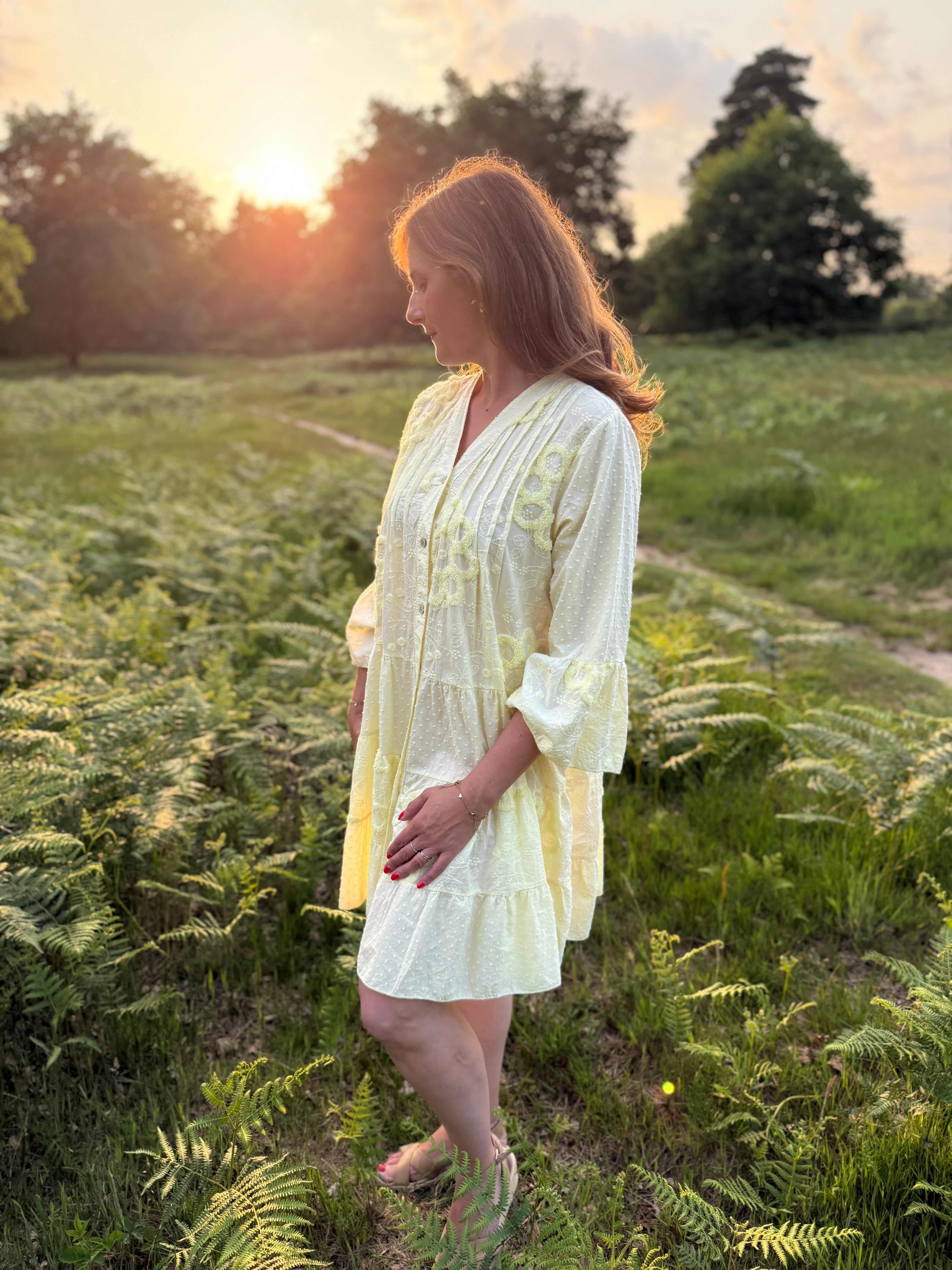 Luftiges kurzes Sommerkleid mit verspielter Blumen Beflockung. Das Kleid fällt locker leicht. Das Kleid hat eine Knopfleiste und einen V Ausschnitt. Die Ärmel sind 3/4 lang. Farbe hellgelb.