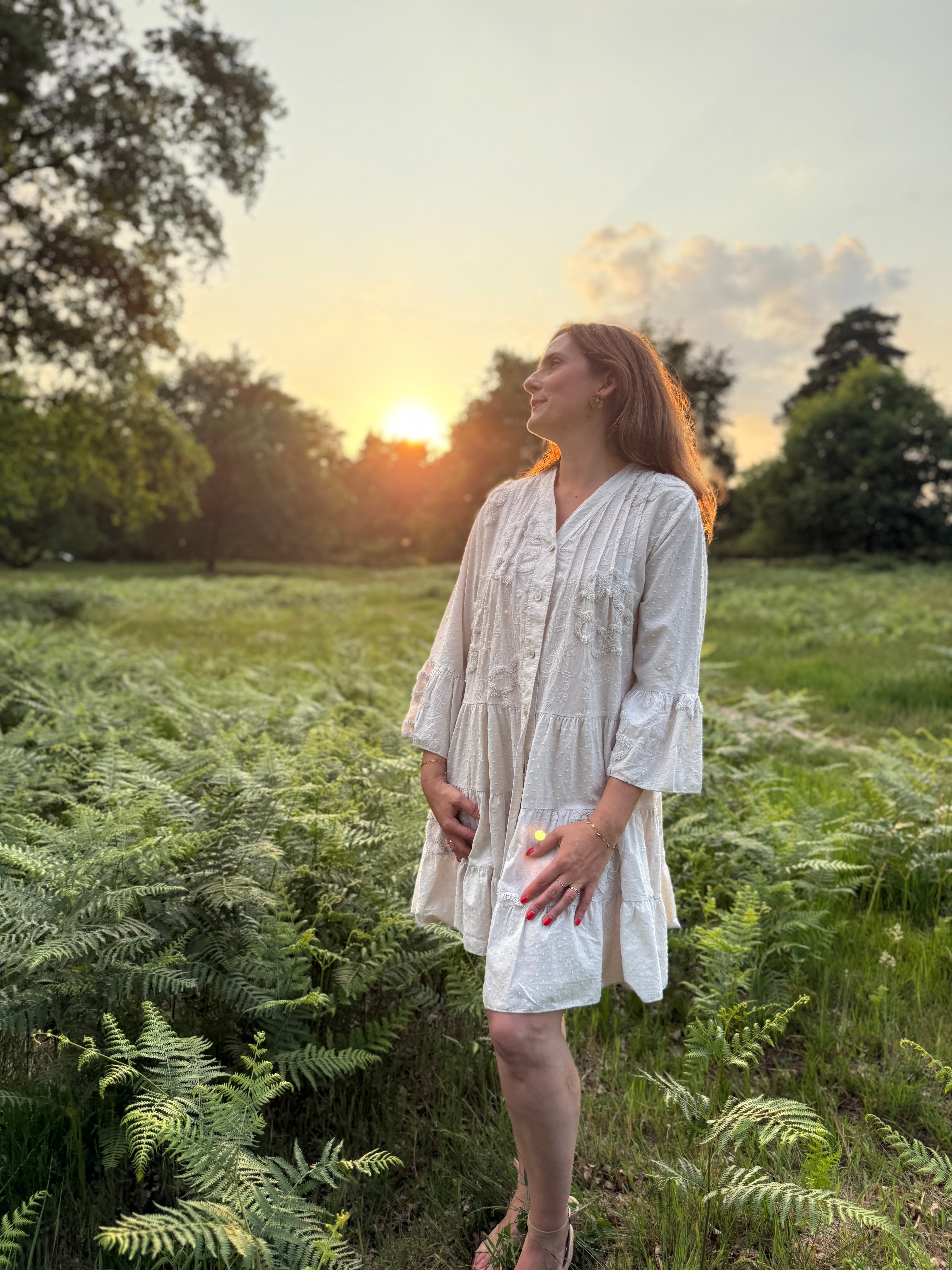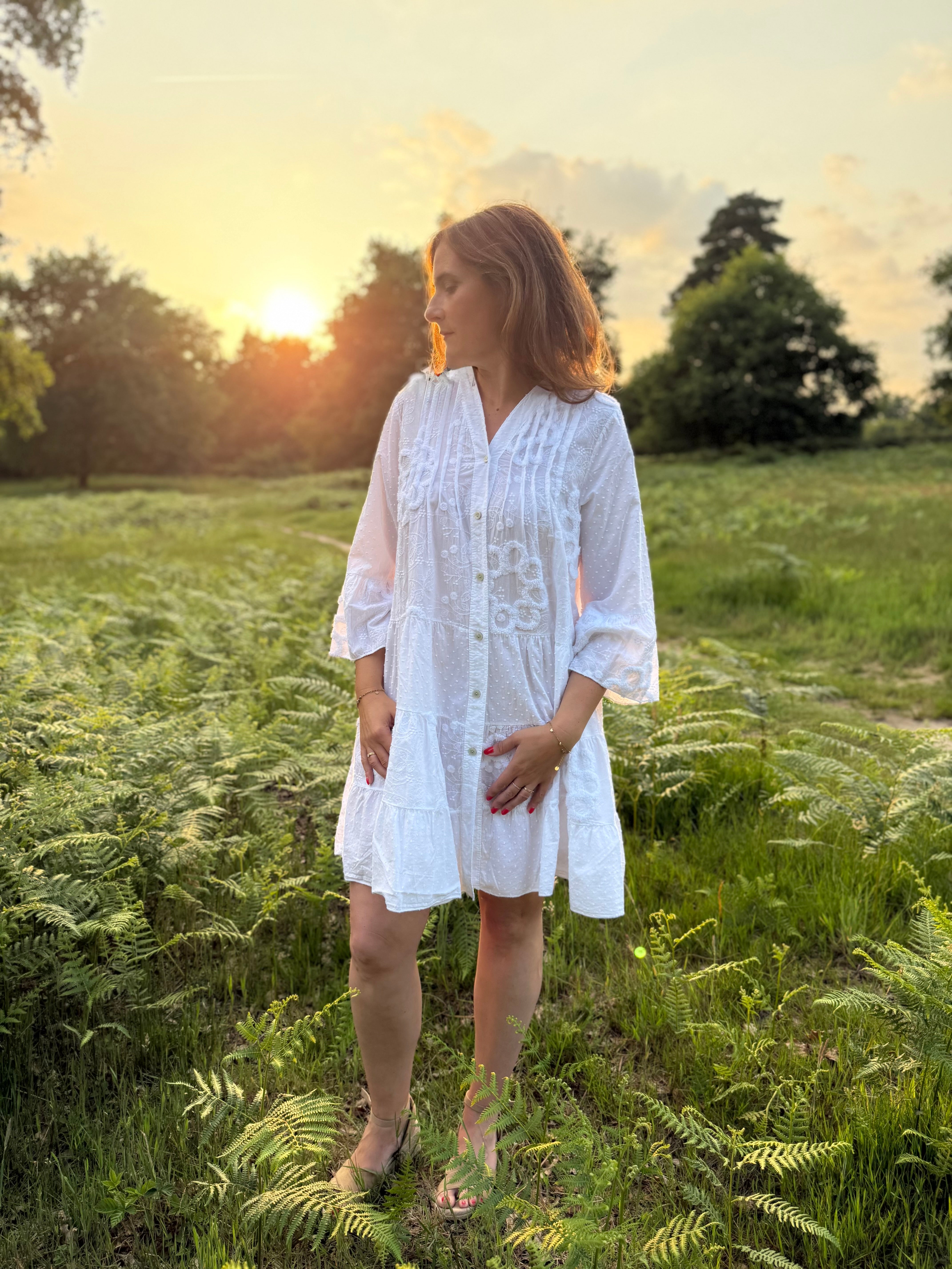 Luftiges kurzes Sommerkleid mit verspielter Blumen Beflockung. Das Kleid fällt locker leicht. Das Kleid hat eine Knopfleiste und einen V Ausschnitt. Die Ärmel sind 3/4 lang. Farbe weiß.