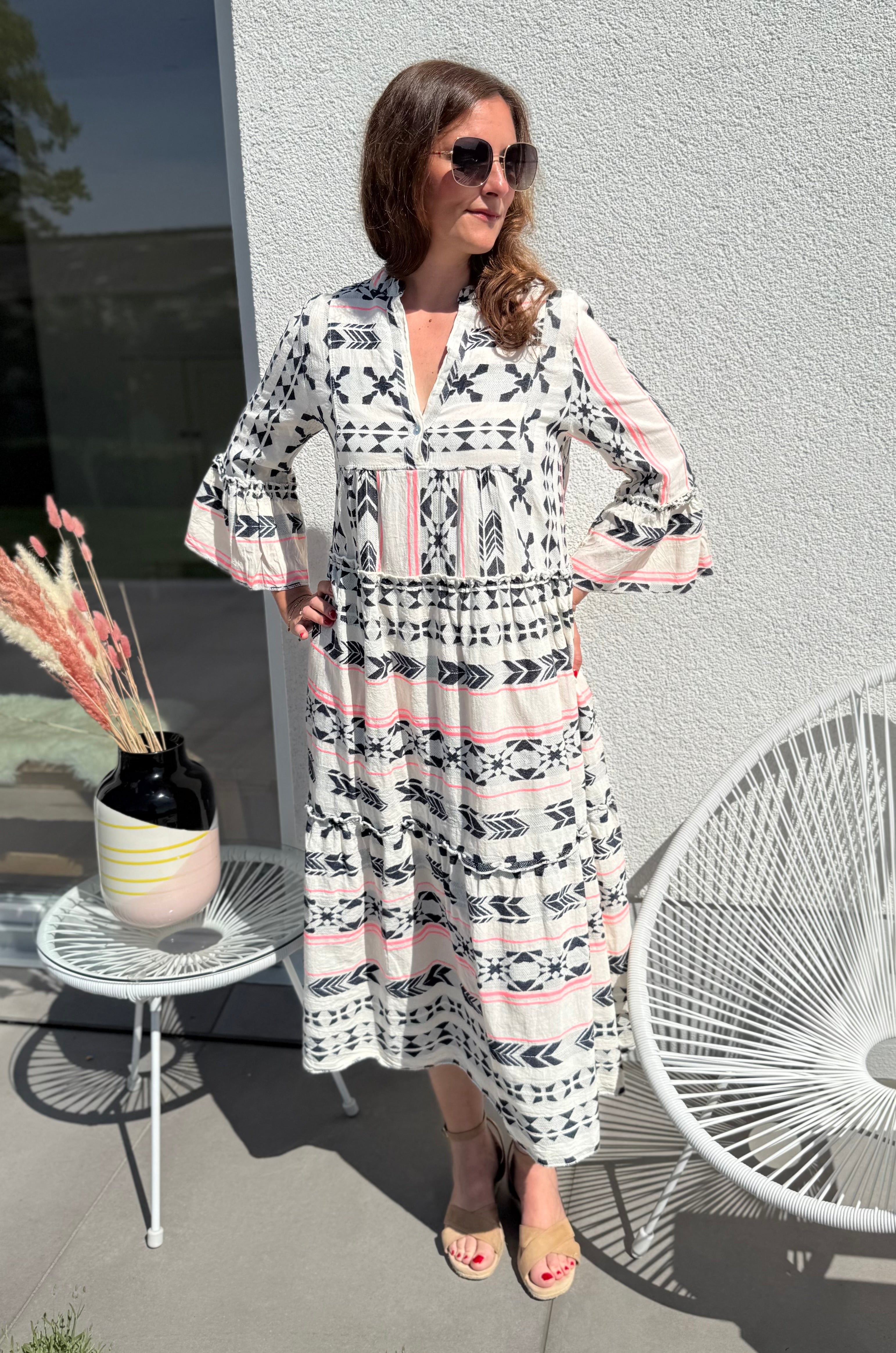Super schönes Maxikleid mit angesagtem Ethno Muster in schwarz-weiß. Die korall-farbenen Details geben dem Kleid einen sommerlichen Farbklecks.