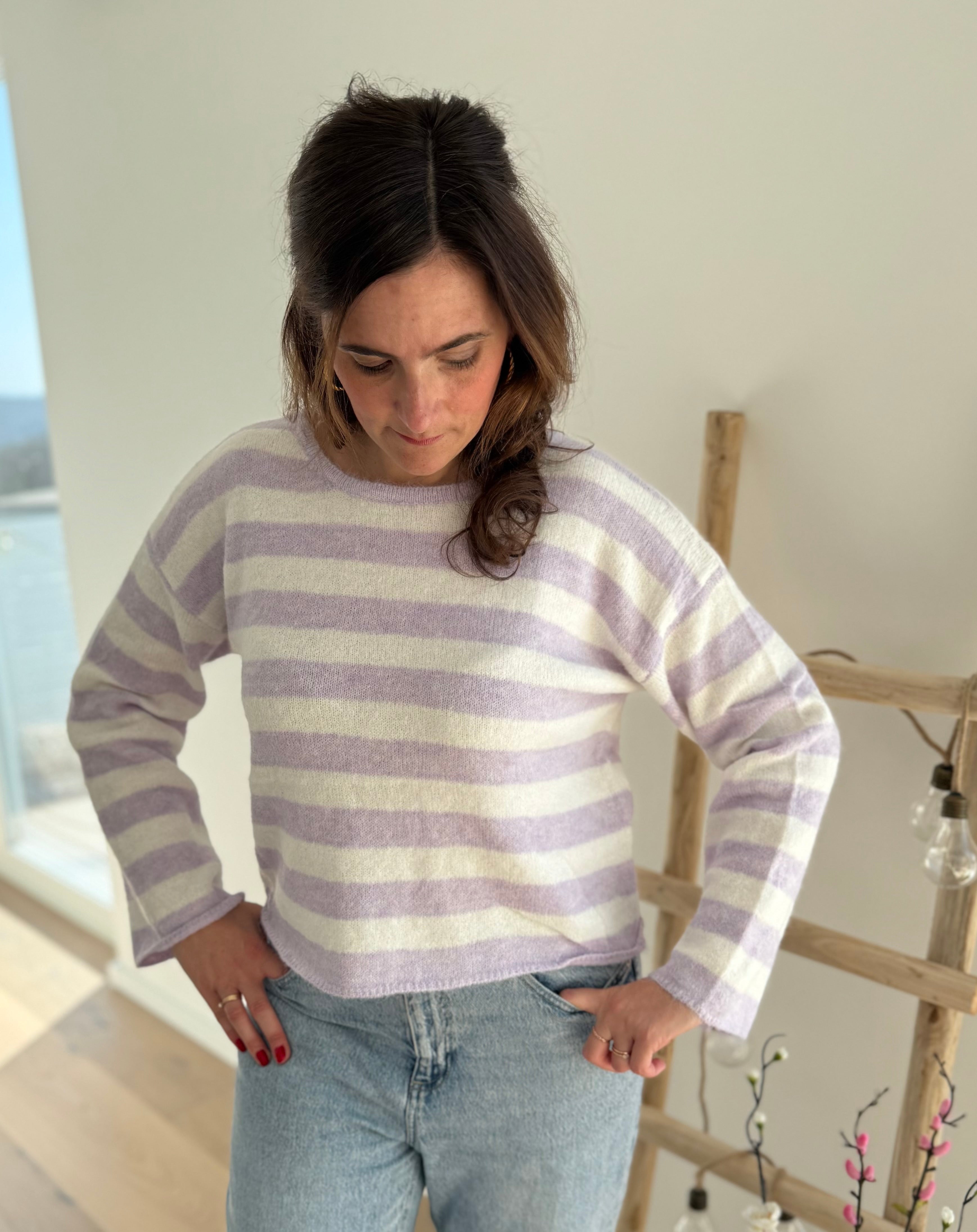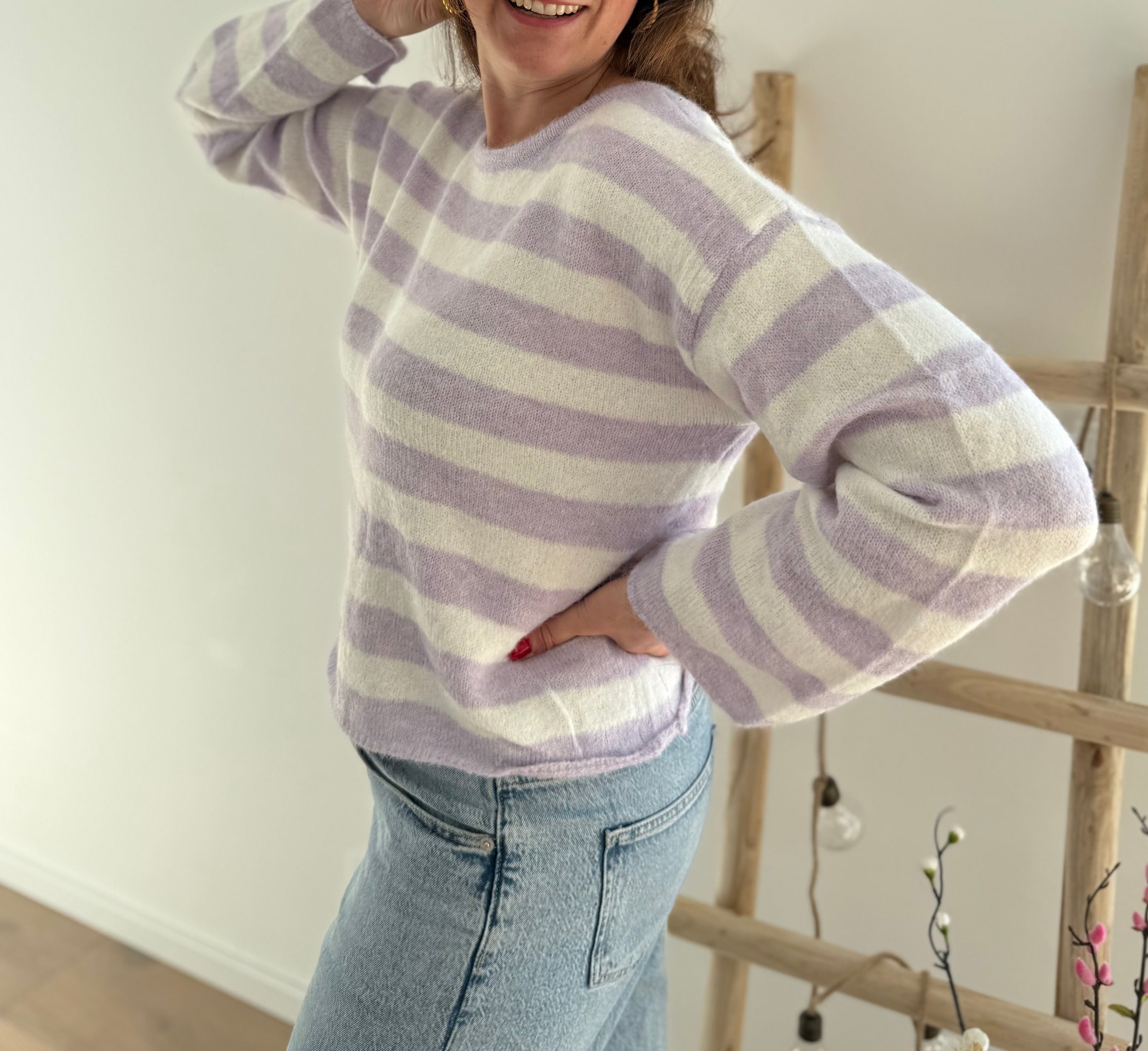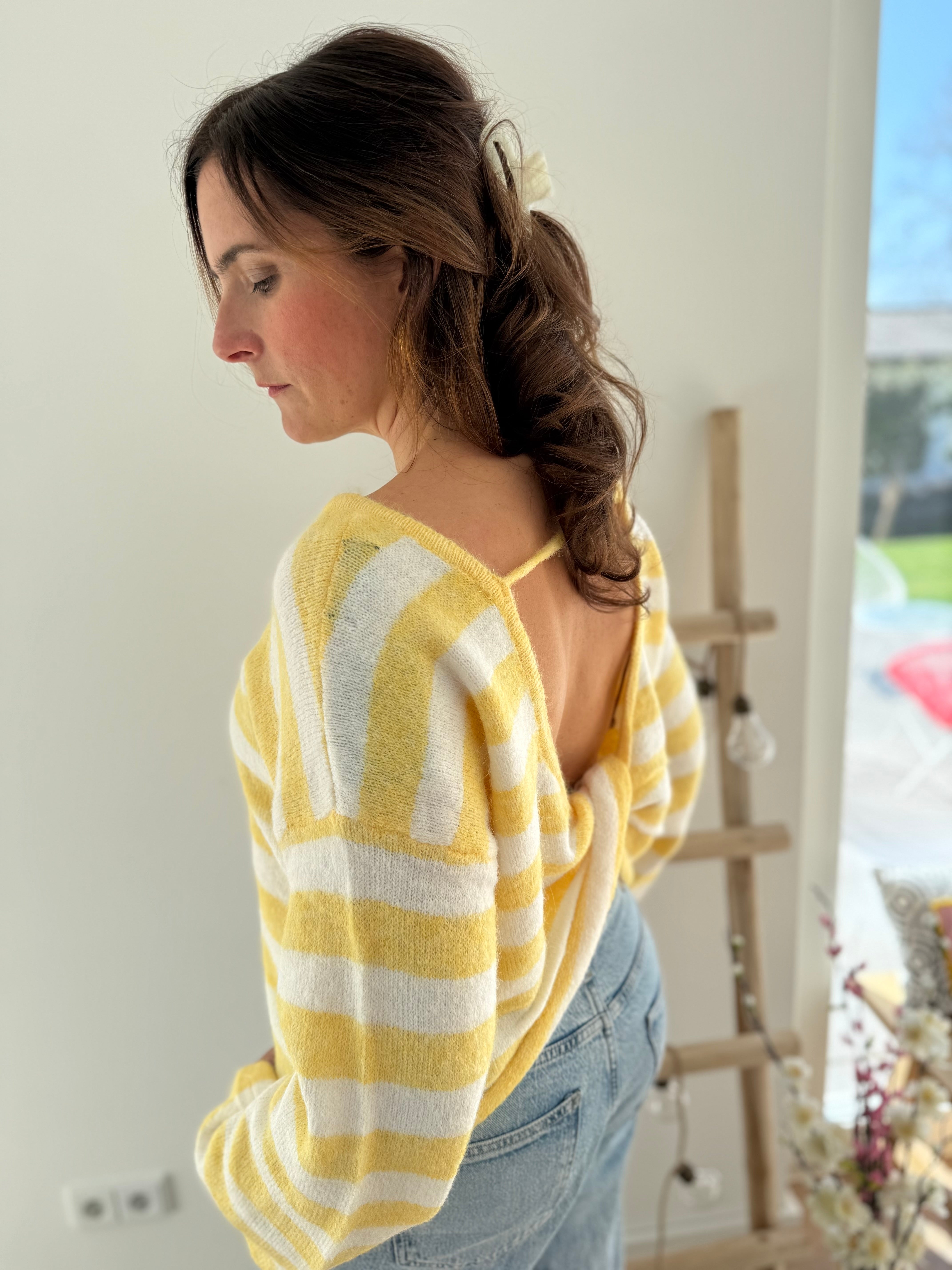 Leichter Pullover mit zarten Pastellstreifen für laue Sommertage. Das absolute Highlight ist der verspielte Rückenausschnitt.