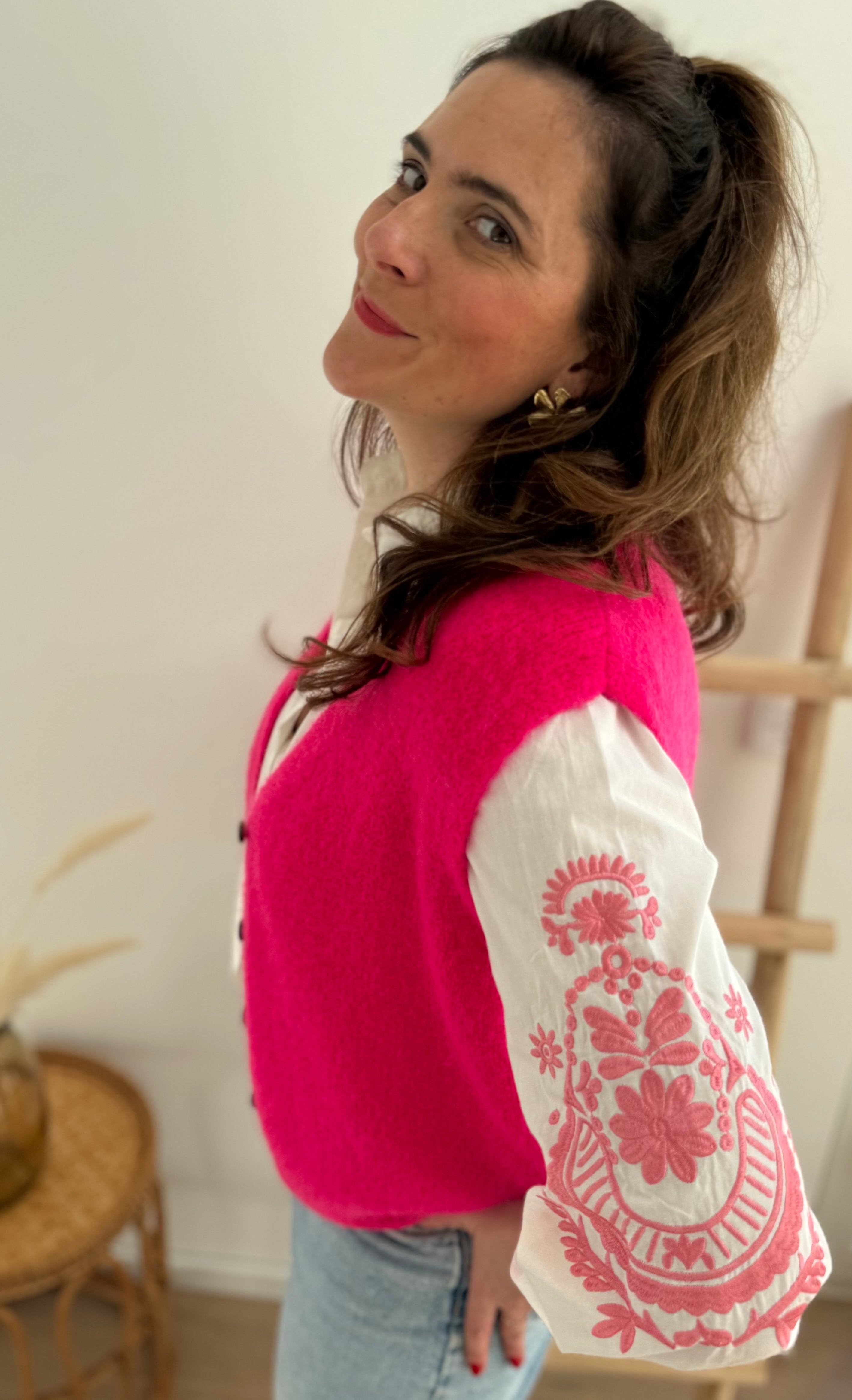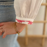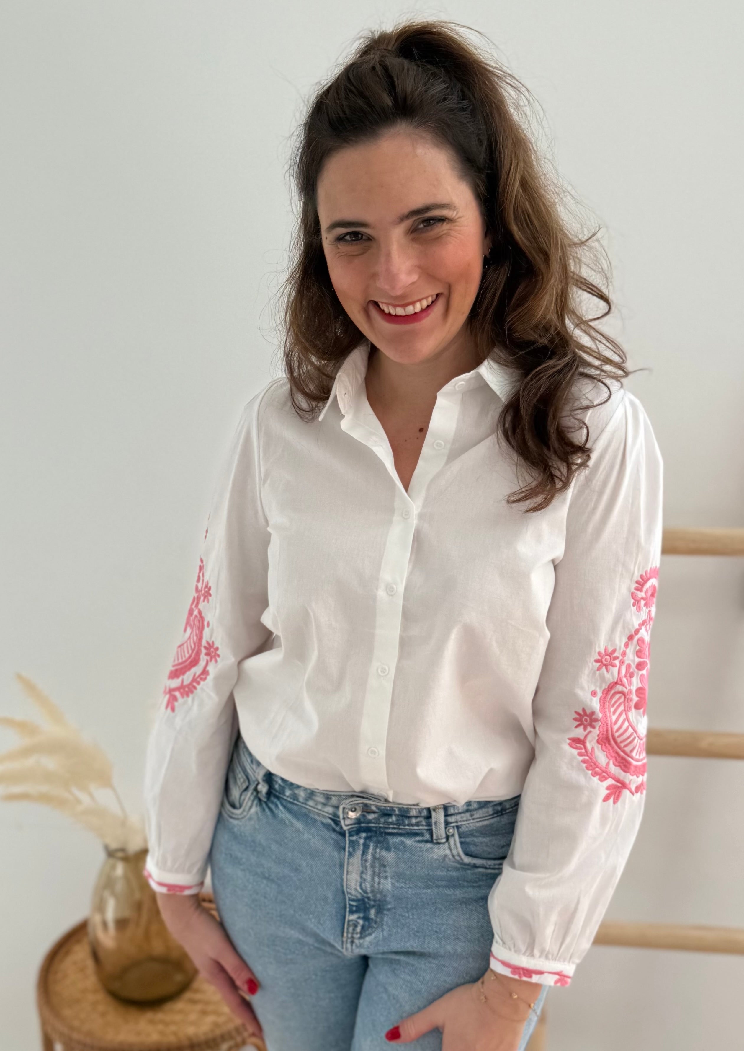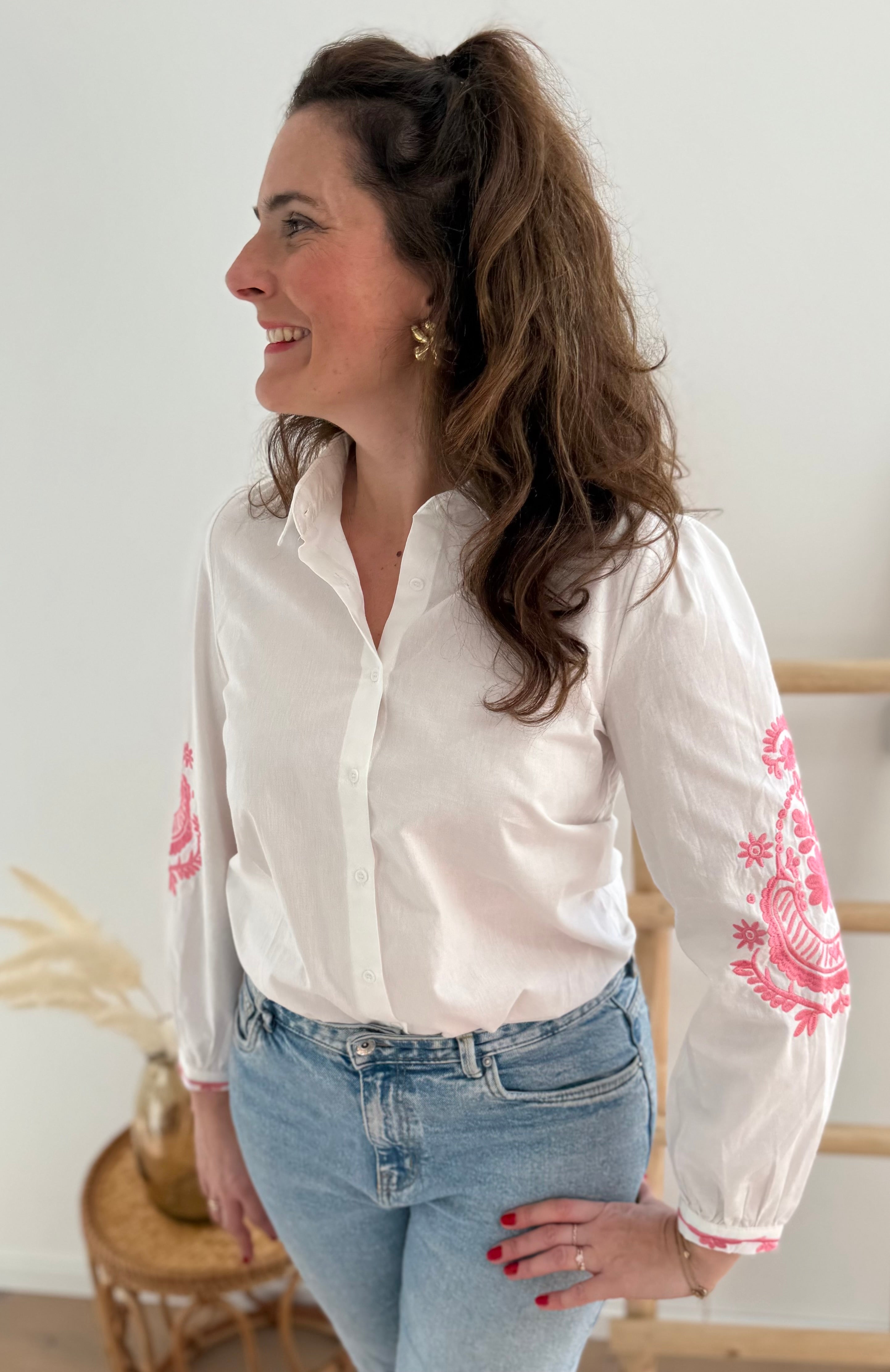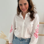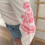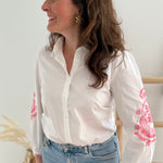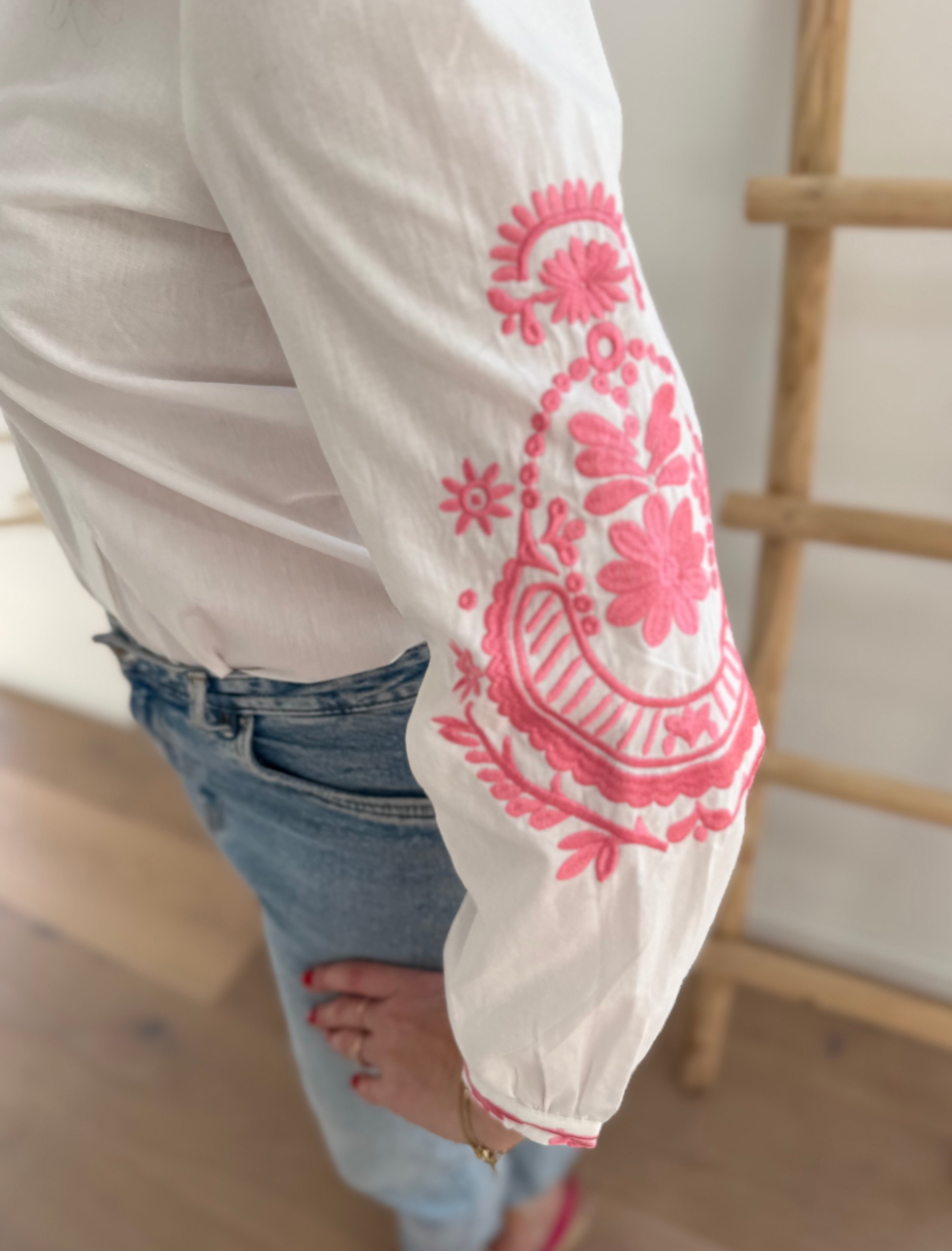 Wunderschöne weiße Bluse mit pinker Blumen Stickerei an den Ärmeln. Ein echter Hingucker für deinen Frühling!