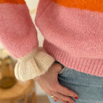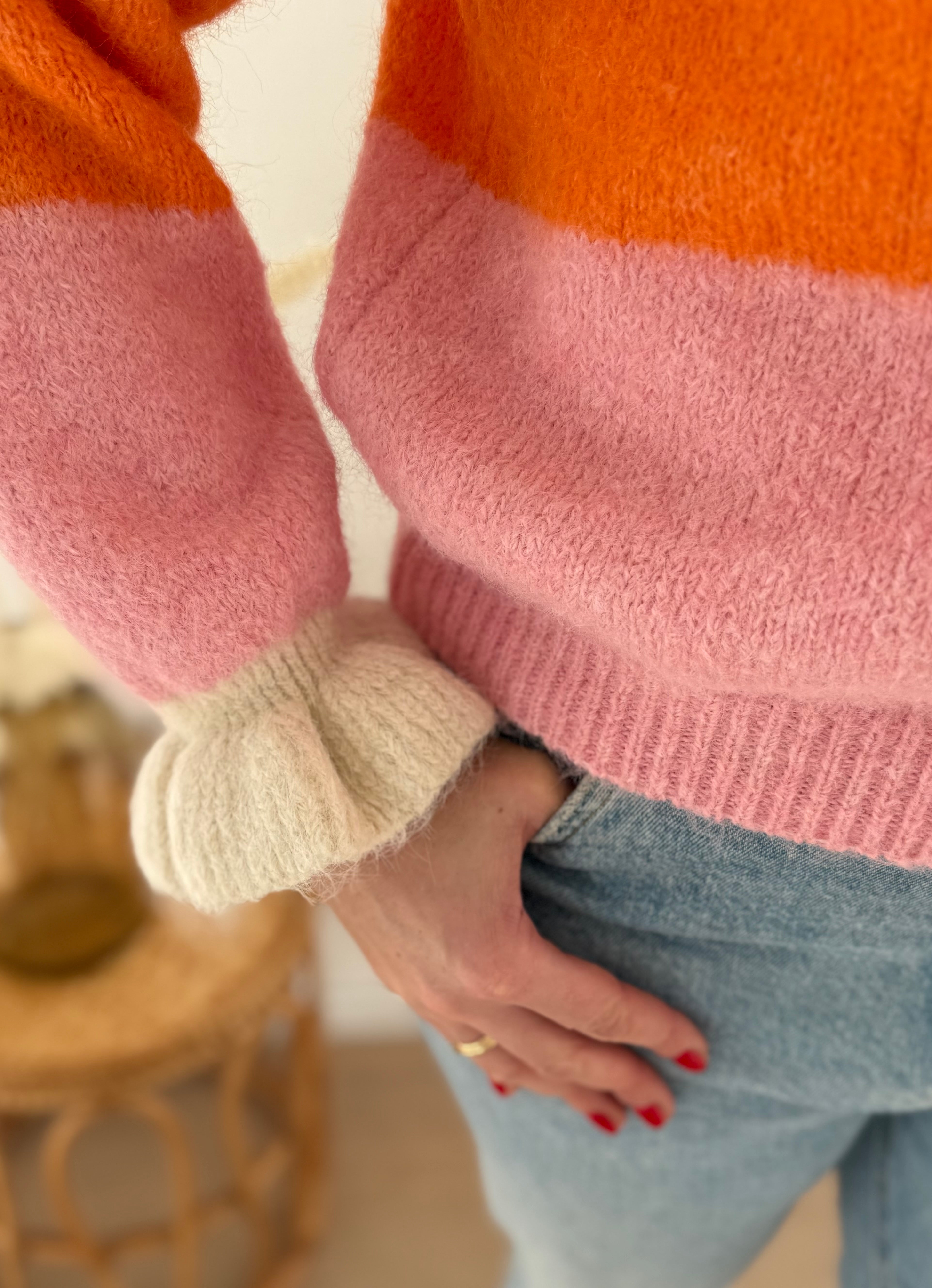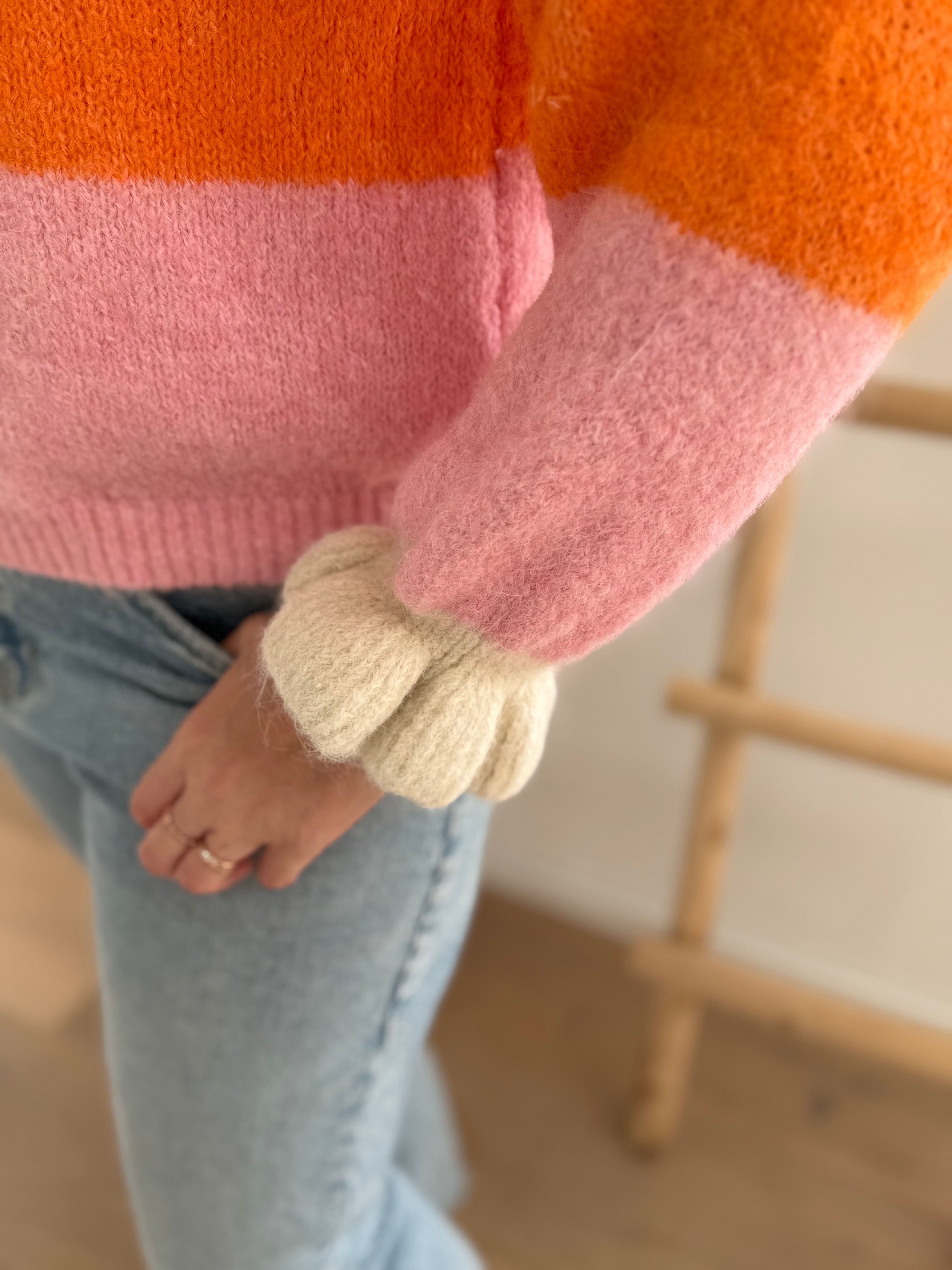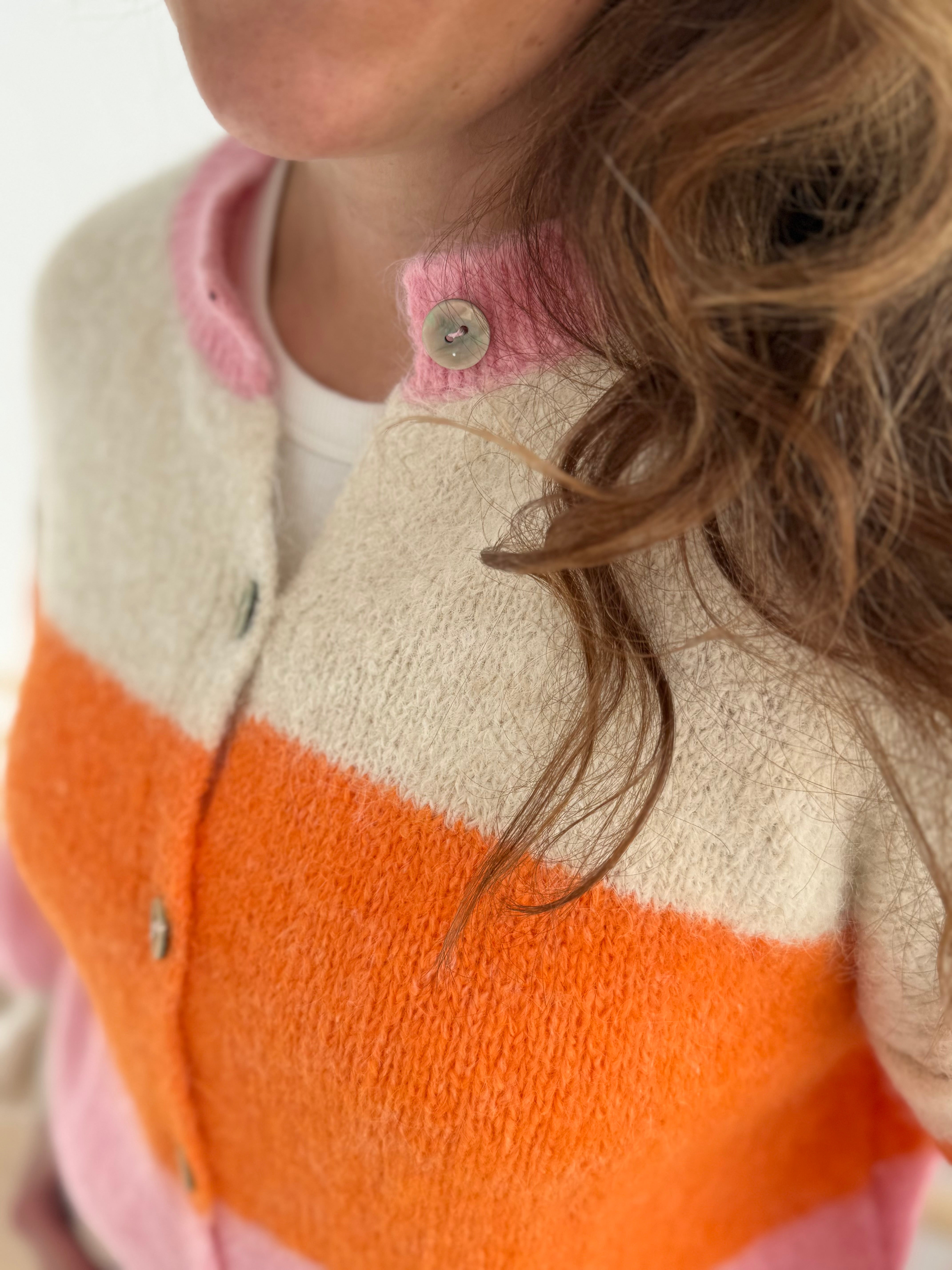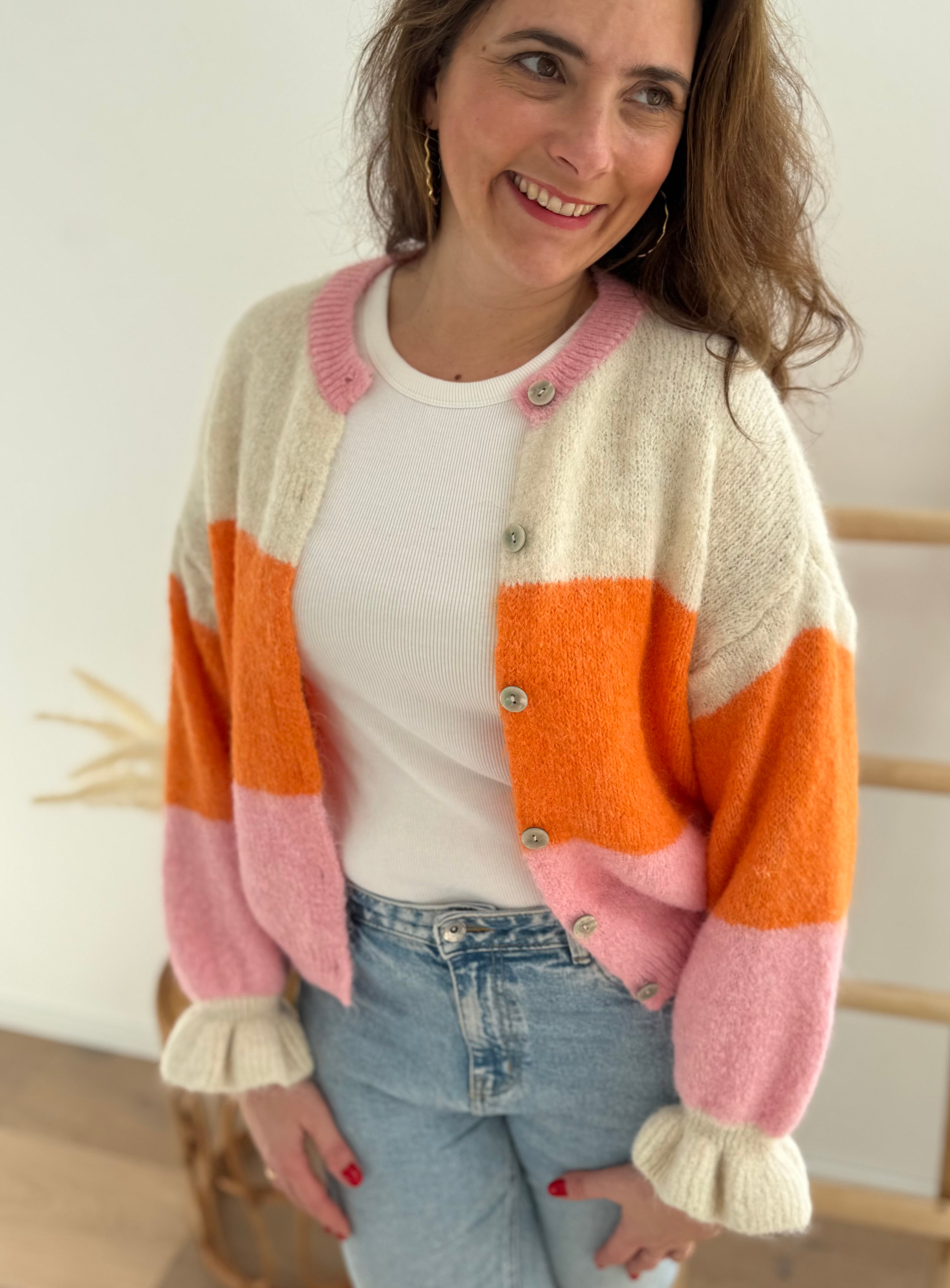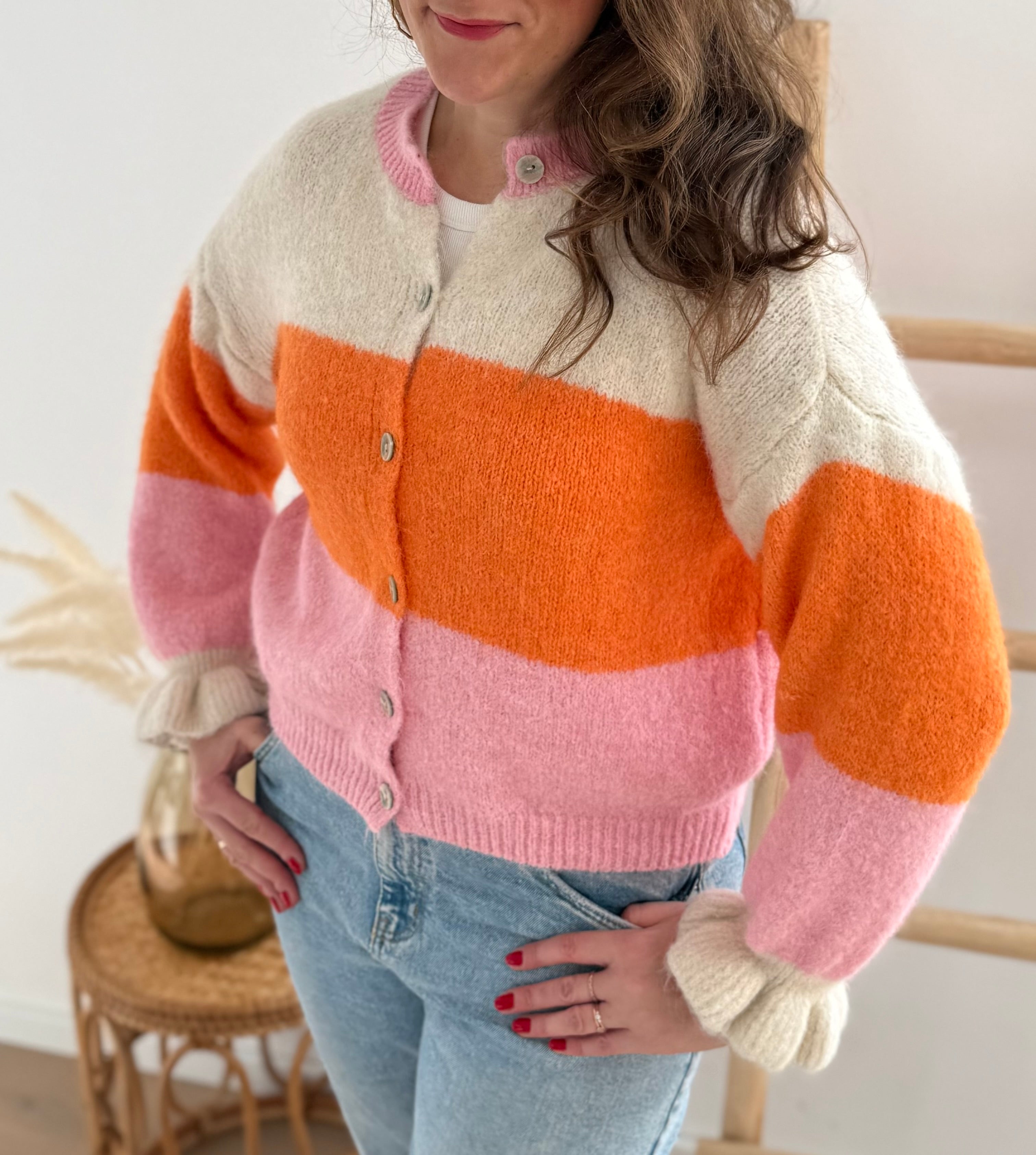 Diese Strickjacke im frischen Colourblocking-Design bringt den Frühling in deinen Kleiderschrank. Die harmonische Kombination aus Rosa, Weiß und Orange sorgt für einen lebendigen Look. Verspielte Abschlüsse an den Handgelenken verleihen der Strickjacke eine besondere, feminine Note. Ein echtes Statement-Piece für sonnige Tage.