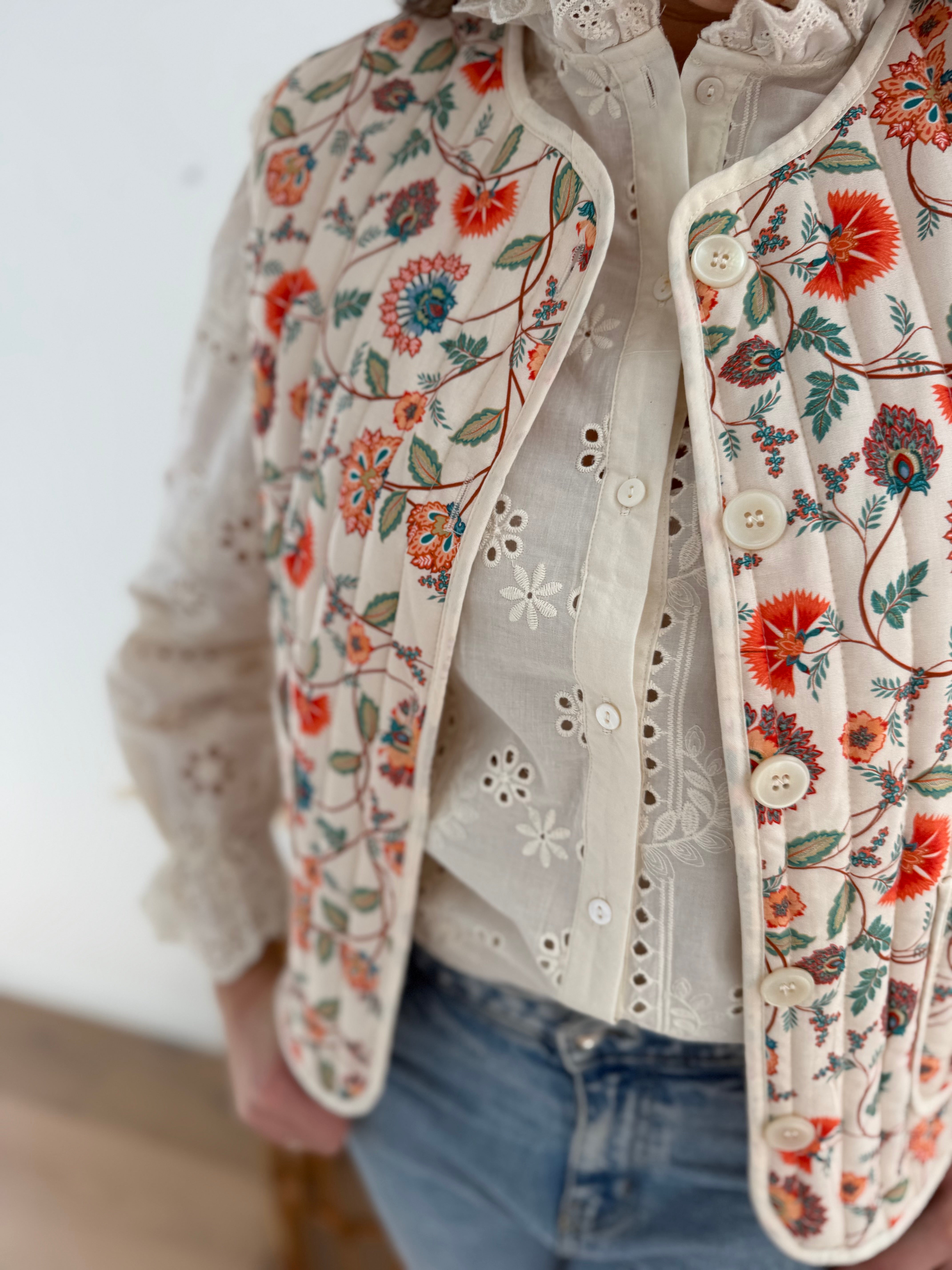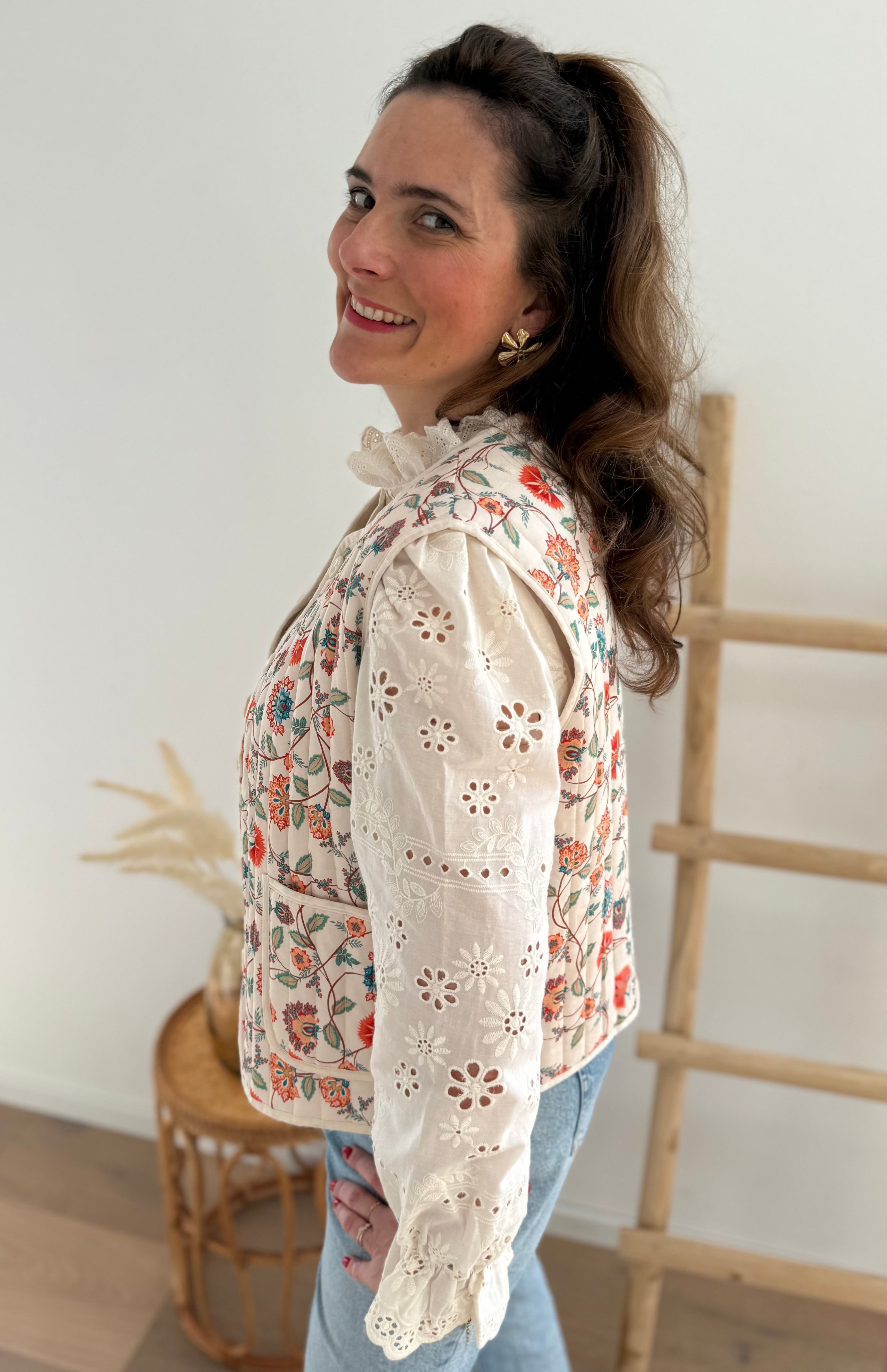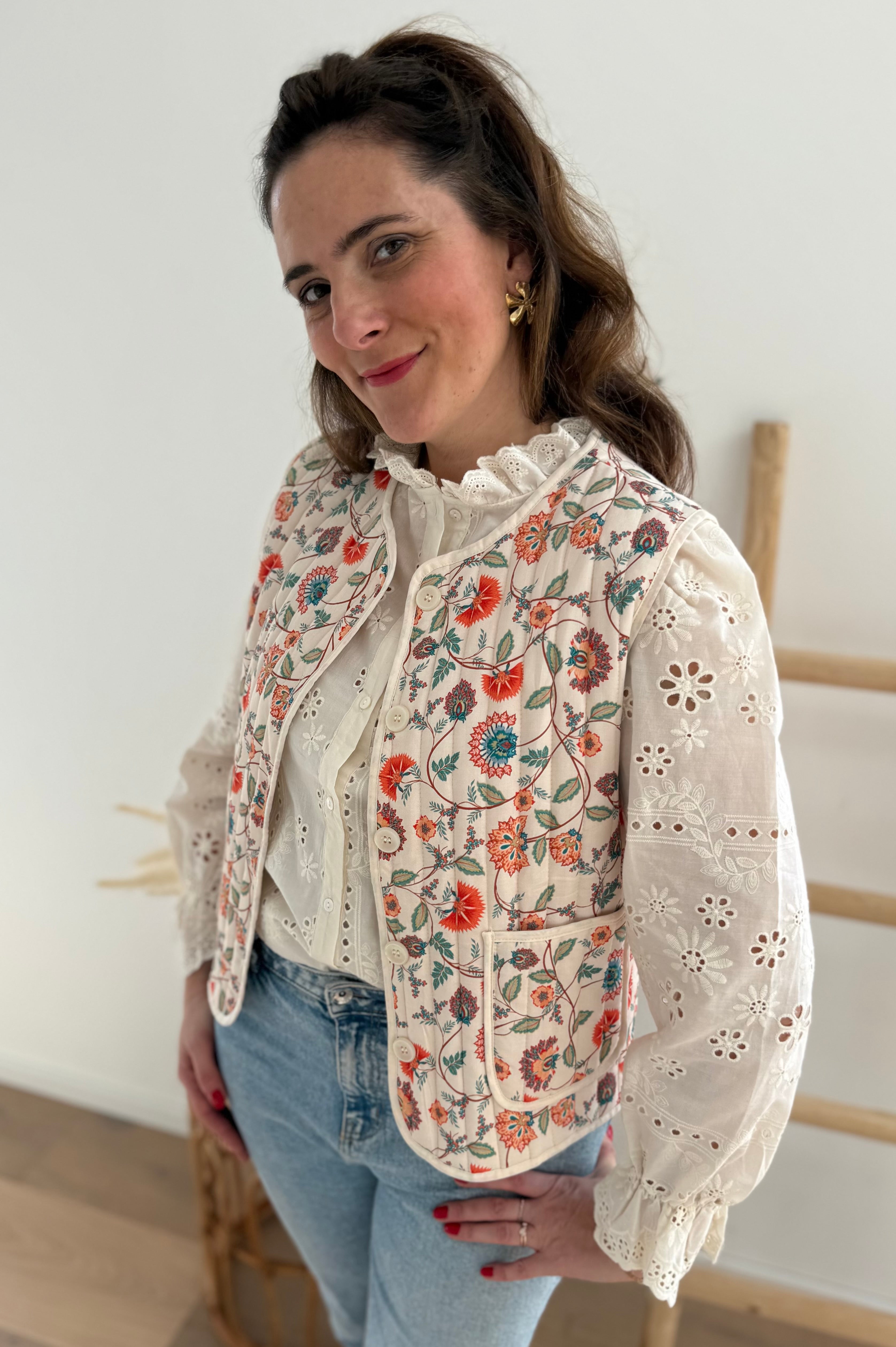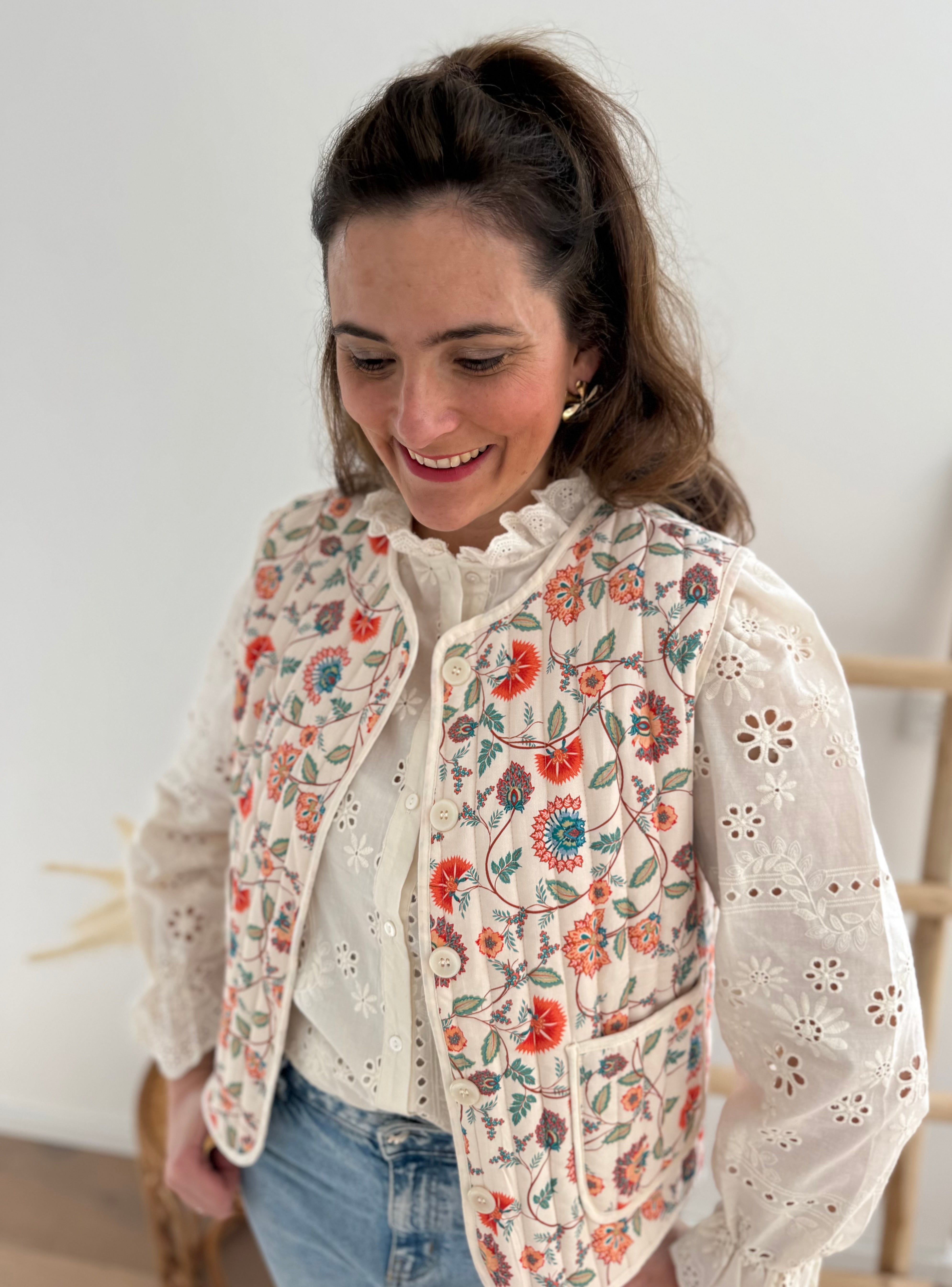 Diese leichte Weste in Beige verzaubert mit einem farbenfrohen Blütenmuster. Der helle Grundton bringt die bunten Details besonders schön zur Geltung und sorgt für einen frischen, lebendigen Look. Dank ihres leichten Materials eignet sie sich perfekt zum Layern über Blusen, Shirts oder Kleider.
